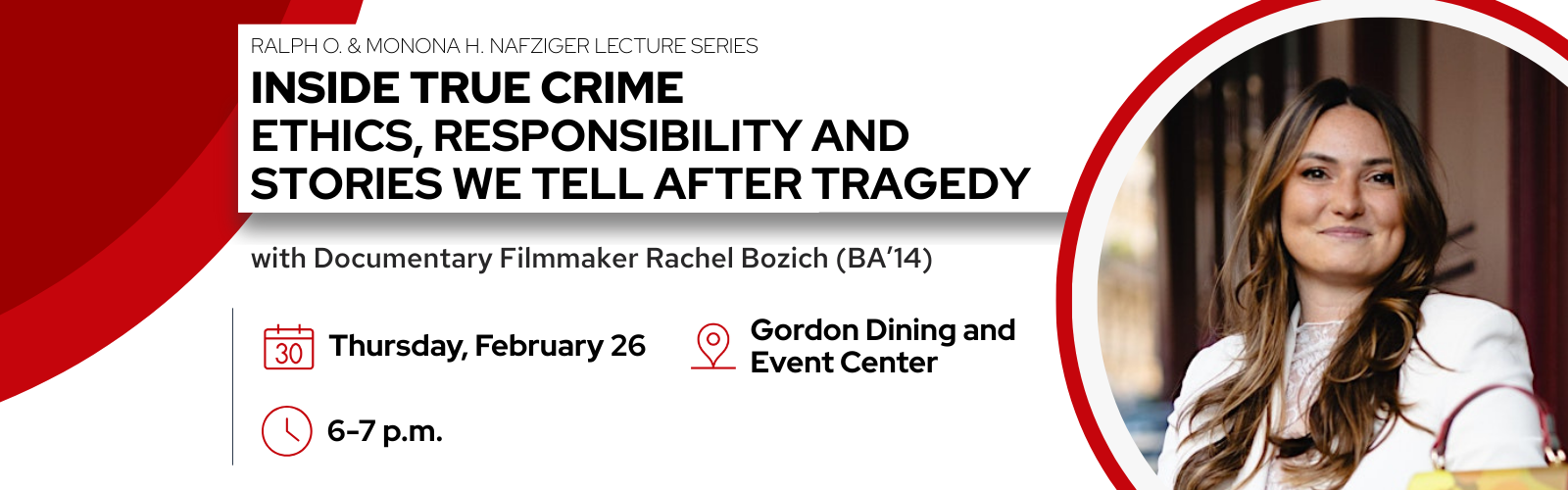 Join us as acclaimed documentary filmmaker and SJMC alum Rachel Bozich (BA’14) takes audiences inside the making of some of the most talked-about true crime series of recent years, including Netflix’s Murdaugh Murders: A Southern Scandal. Drawing from her work with Netflix, Amazon and HBO, Bozich will reflect on how these projects come to life and the creative choices that shape how stories are told. She will also explore the ethical responsibility that comes with documenting real people, real loss and real consequences. The lecture will conclude with a Q&A, offering students, alumni and guests the chance to engage directly with Bozich about storytelling, ethics and the enduring fascination with true crime.